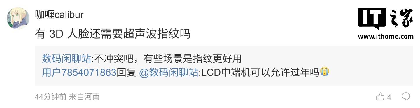 后续有用户在评论区表示:“不重要不重要,重要的是华为 mate 系列标准版都有 3d 人脸了,我真的爱了”,博主回复道:“哈哈哈哈花粉过年了”;另一名用户则询问道:“有 3D 人脸还需要超声波指纹吗”,博主则回复道:“不冲突吧,有些场景是指纹更好用”。