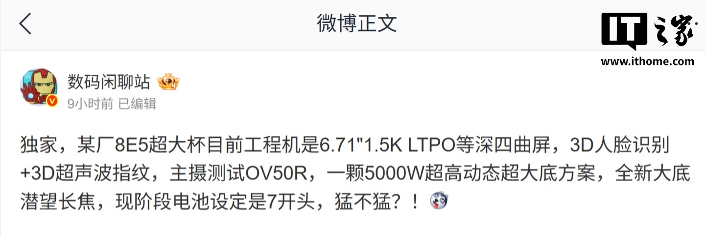 结合博主此前爆料,某厂的骁龙 8 Elite Gen 5 芯片超大杯工程机搭载 6.71 英寸 1.5K LTPO 等深四曲面屏,拥有全新大底潜望长焦镜头,现阶段电池设定在 7000mAh 以上,预计为荣耀 Magic 8 Ultra。