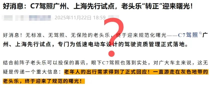 但近期,不少自媒体开始热炒“C7驾照”,称持该证即可驾驶四轮低速电动车——俗称“老头乐”,并宣称年底将在上海、广州、成都等地试点,明年全国推广。对此,相关城市公安交通管理部门已明确否认。